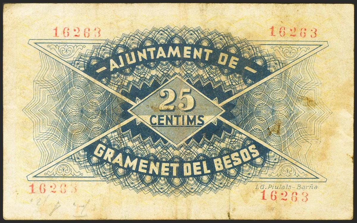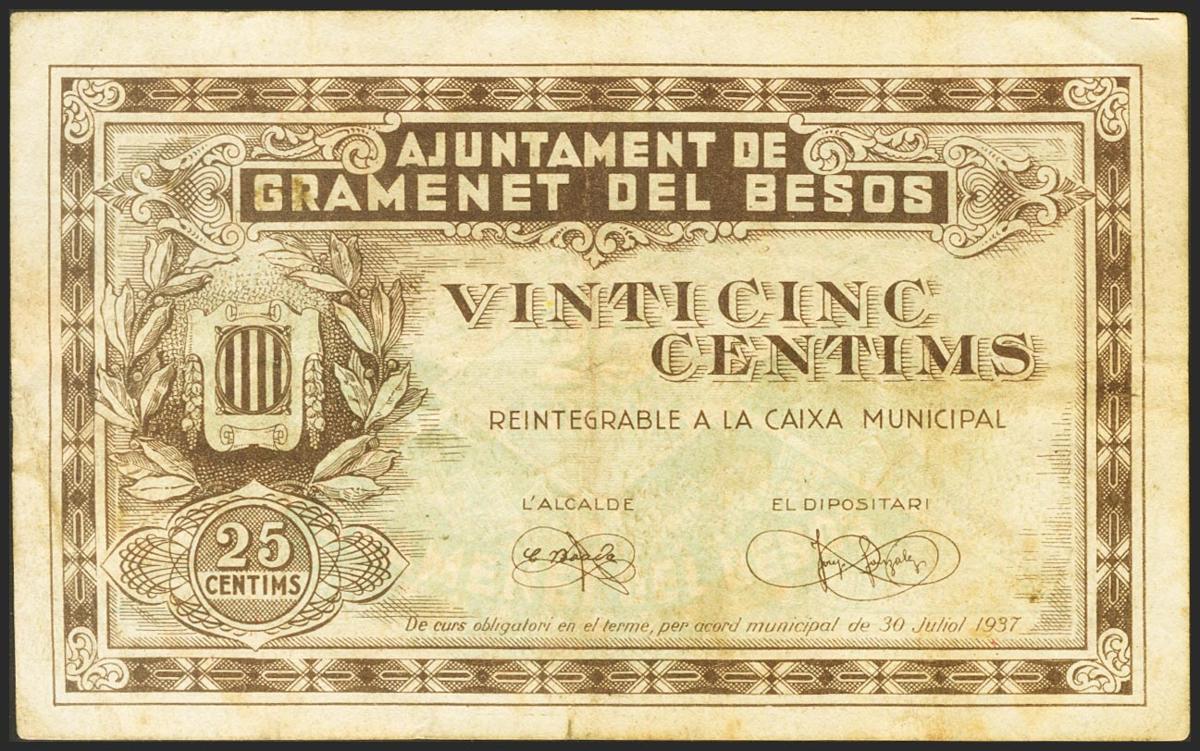 GRAMANET OF KISSES (BARCELONA). 25 cents. July 30, 1937. (González: 8076). Good Very Fine.
