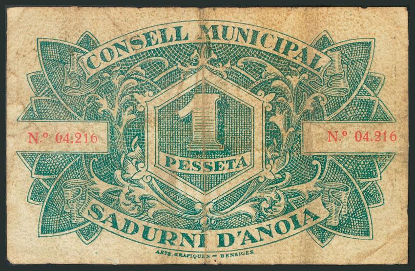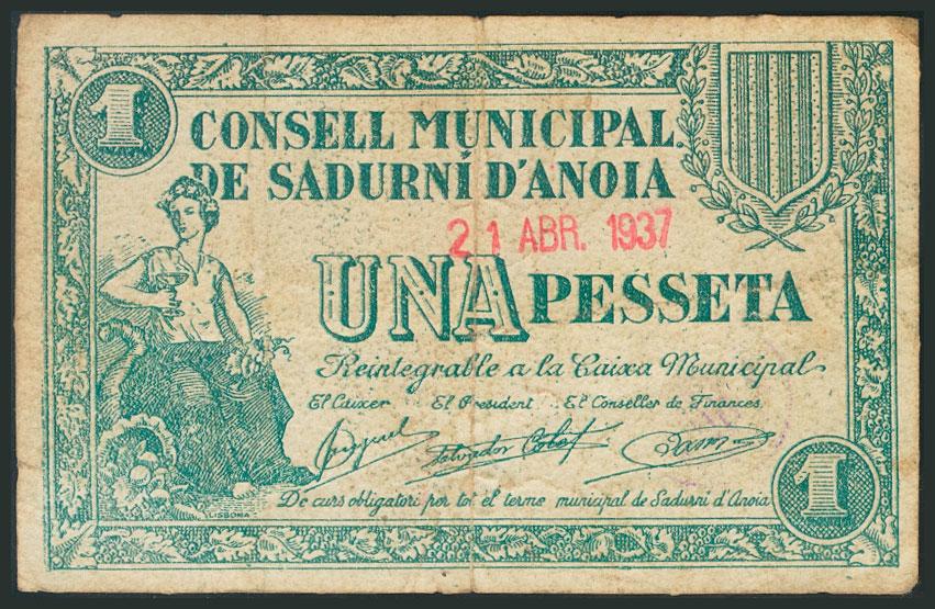 English SADURNI D´ANOIA (BARCELONA). 1 Peseta. April 21, 1937. (González: 9802). Fine.