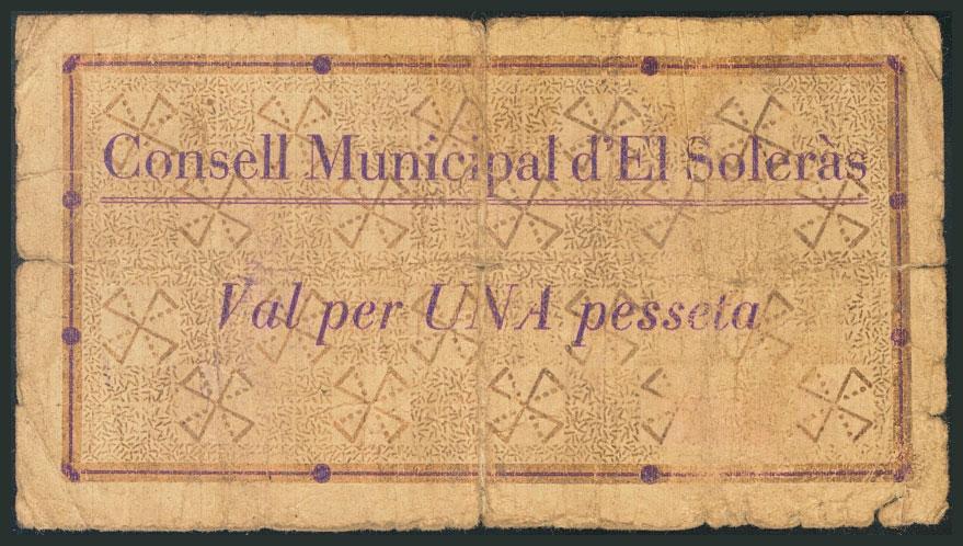 English SOLERAS (LERIDA). 1 Peseta. August 1937. (González: 10021). Very rare. Good.