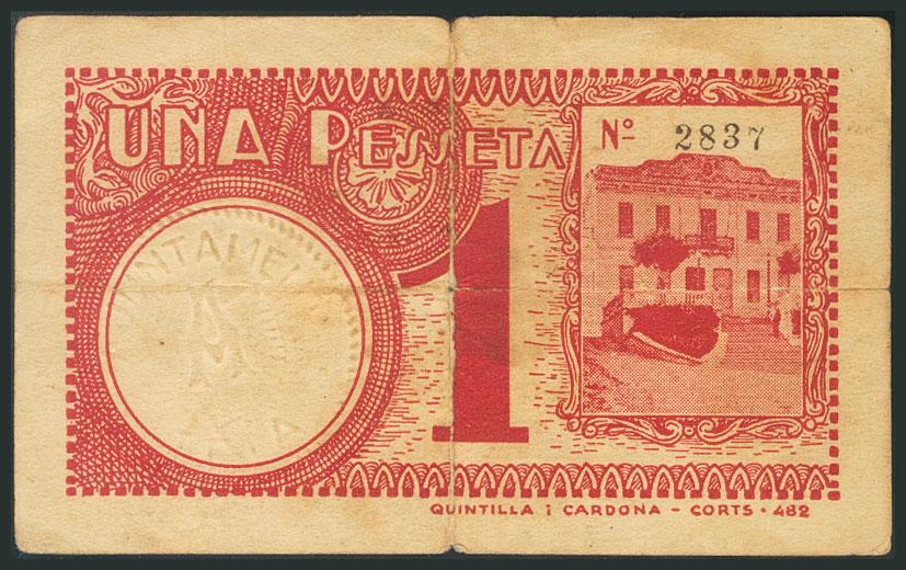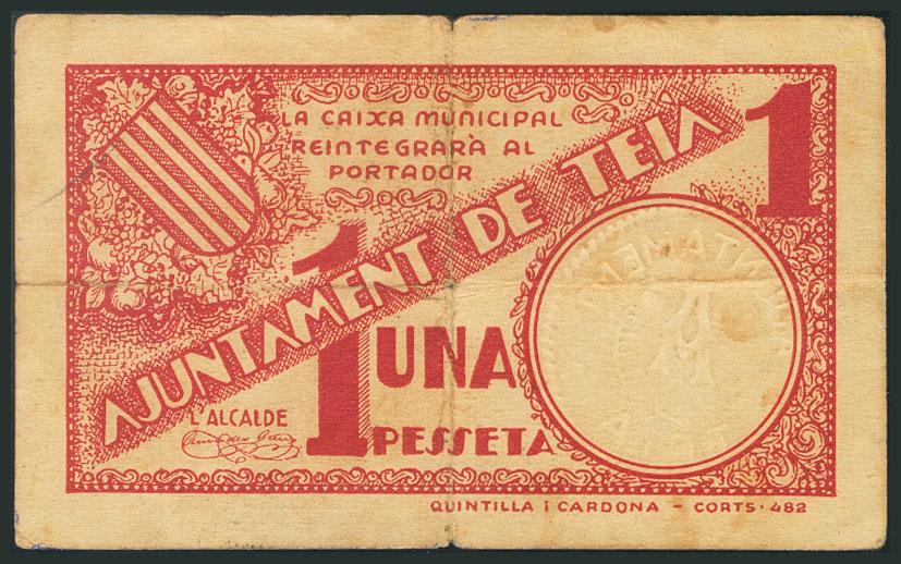 TEIA (BARCELONA). 1 Peseta. (1938ca). (Gonzalez: 10124). unusual. Fine.