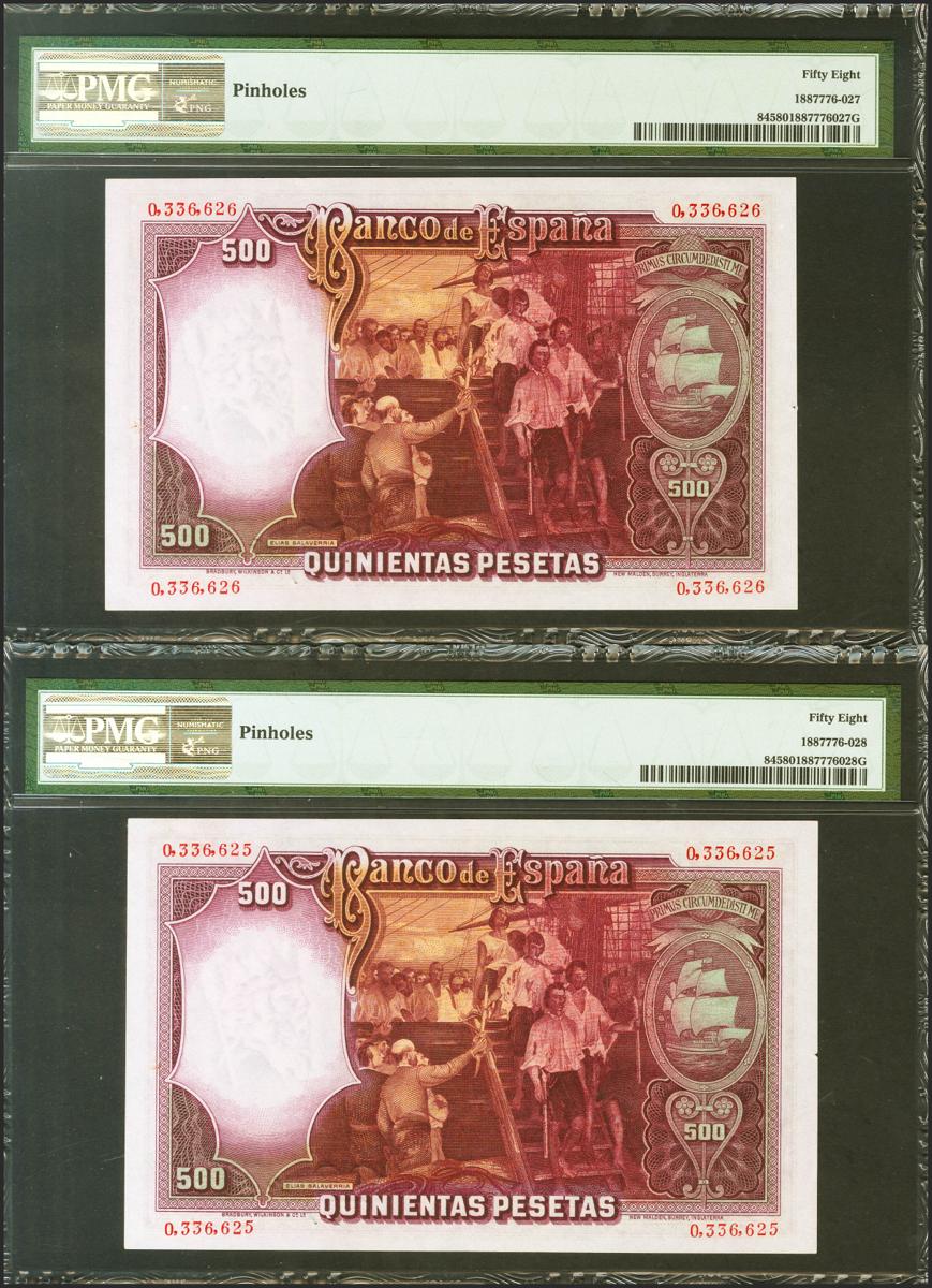 500 pesetas. April 25, 1931. Correlative couple. No serie. (Edifil 2021: 361, Pick: 84). Staple points. EBC++. PMG58 packages, both.