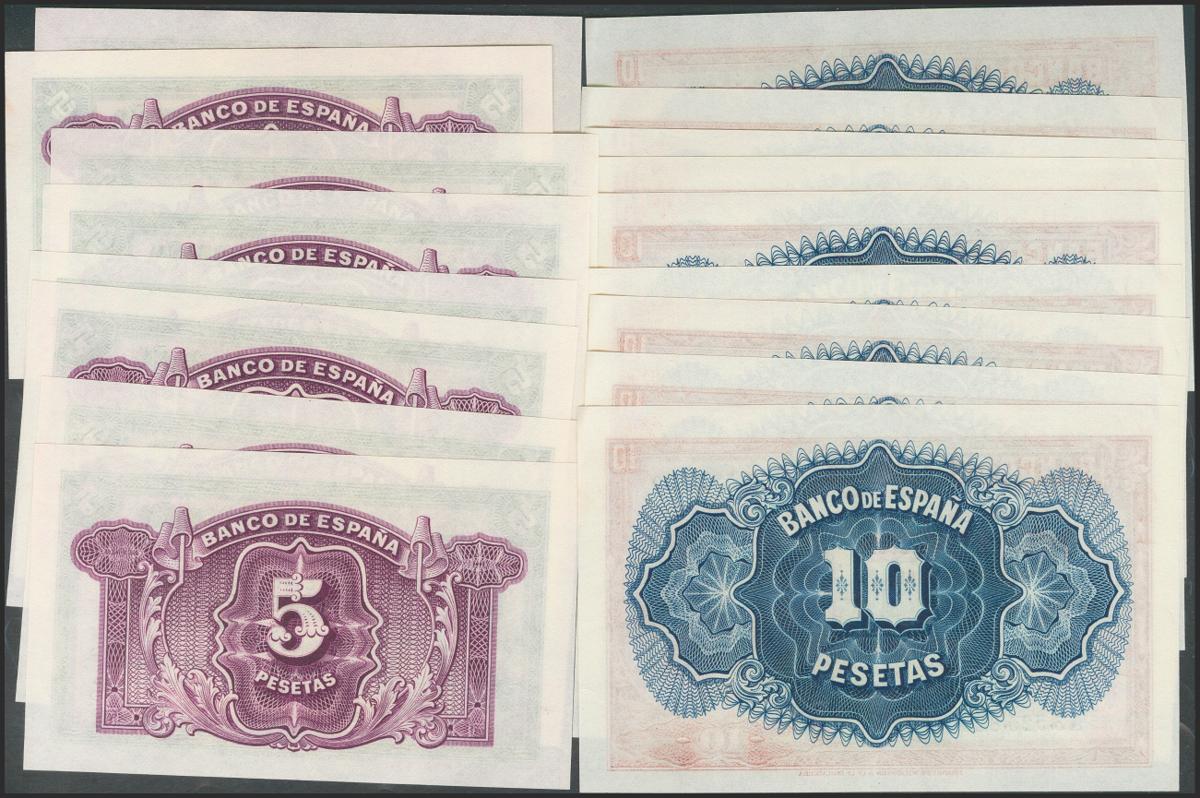 Set of 9 complete series of correlative 5 Pesetas and 10 Pesetas banknotes issued in 1935, with series C and A, respectively. (Edifil 2017: 363/64a). Almost Uncirculated.
