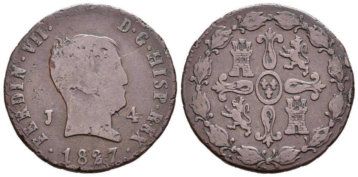 English FERDINAND VII (1808-1833). 4 Maravedís (Ae. 4.93g/24mm). 1827. Jubia. Head type. (Cal-2019-166). Almost Very Fine. Limited.