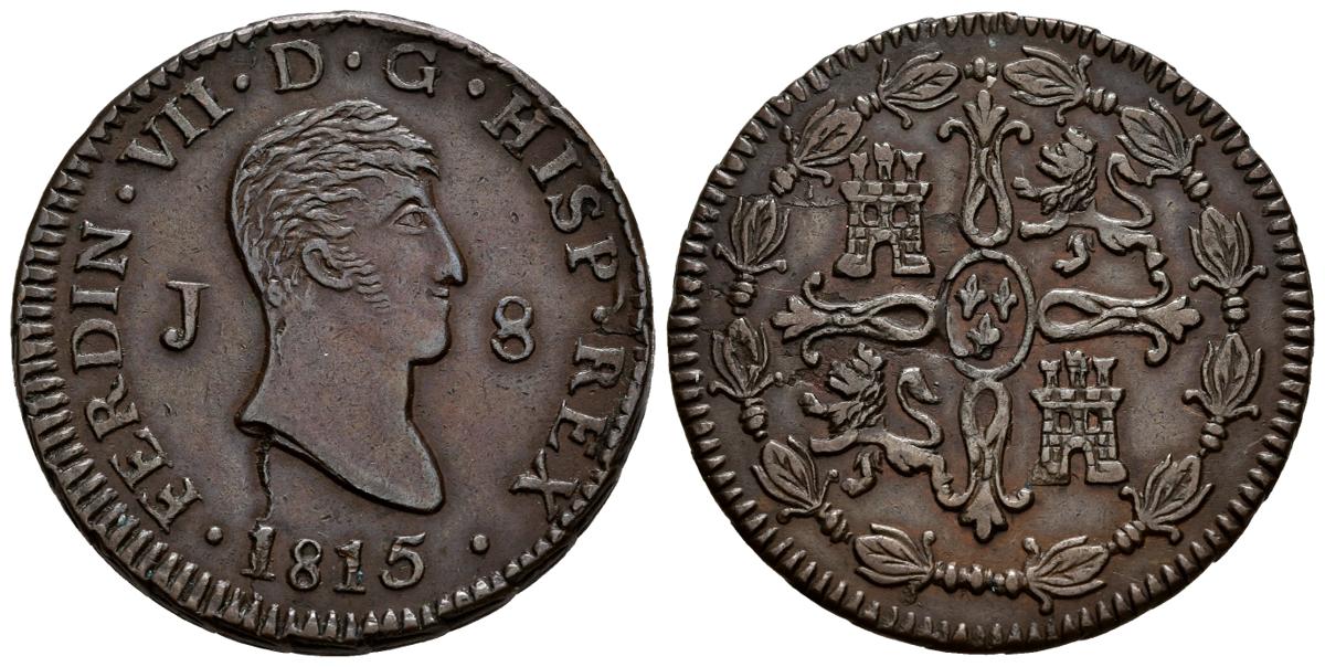 FERDINAND VII (1808-1833). 8 Wonders. (Ae. 10.25/29mm). 1815. Jubia. Naked bust. (Cal-2019-193). Extremely Fine. Die break on obverse. Beautiful specimen, rare like this.