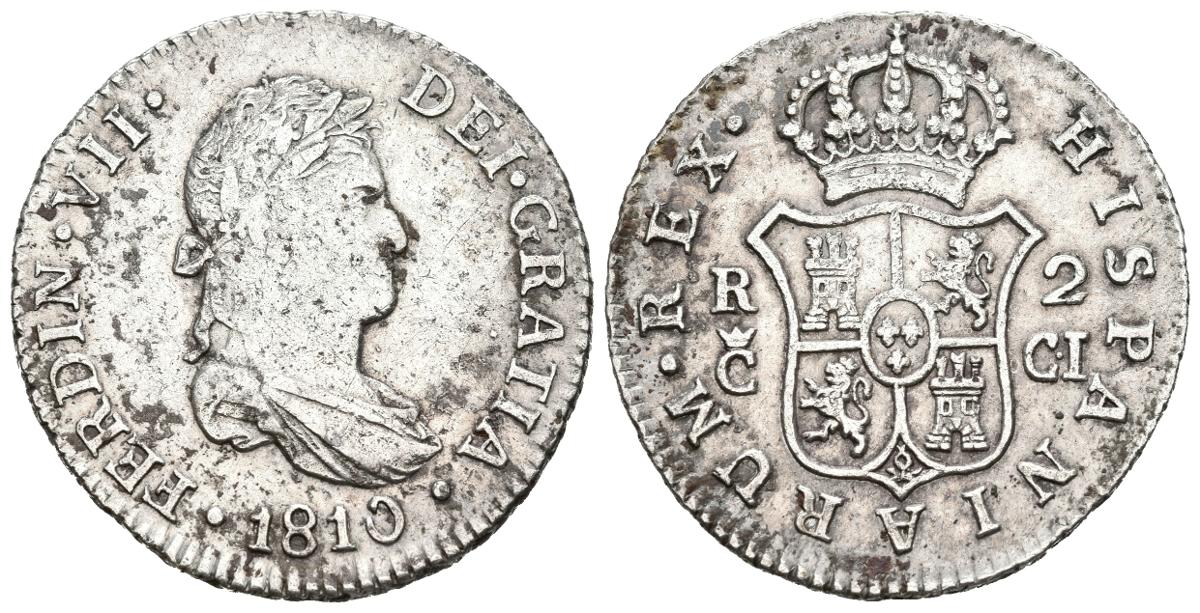 English FERDINAND VII (1808-1833). 2 Reales (Ar. 5.94g/27mm). 1810. Cadiz CI. (Cal-2019-725). Large mint mark. Very Fine.