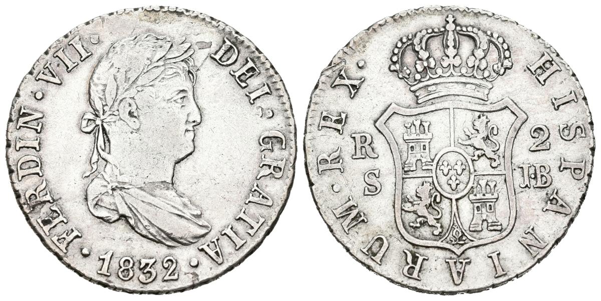 English FERDINAND VII (1808-1833). 2 Reales (Ar. 5.97g/26mm). 1832. Sevilla JB. (Cal-2019-966). Good Very Fine. Slight scratch.