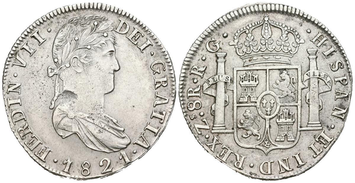 English FERDINAND VII (1808-1833). 8 Reales. (Ar. 26.48g/39mm). 1821. Zacatecas RG. (Cal-2019-1465). Good Very Fine. Nice specimen.
