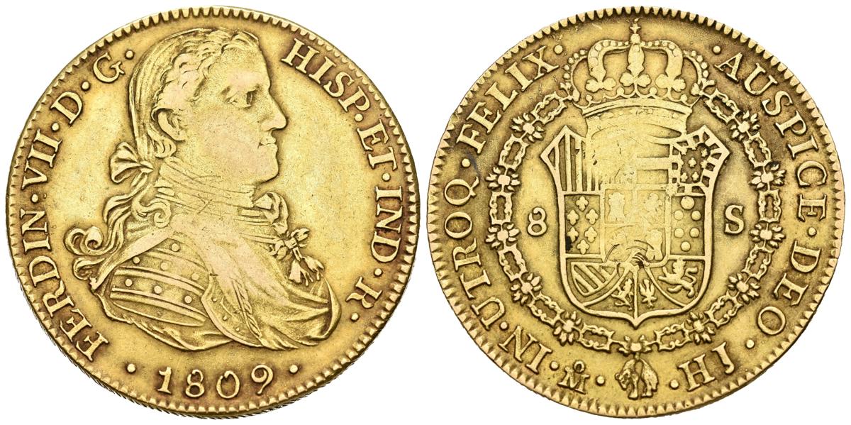 English FERDINAND VII (1808-1833). 8 Escudos. (Aug. 26.96g/37mm). 1809. Mexico HJ. Imaginary bust. (Cal-2019-1782). Point between ET and IND Almost Very Fine. nice tone