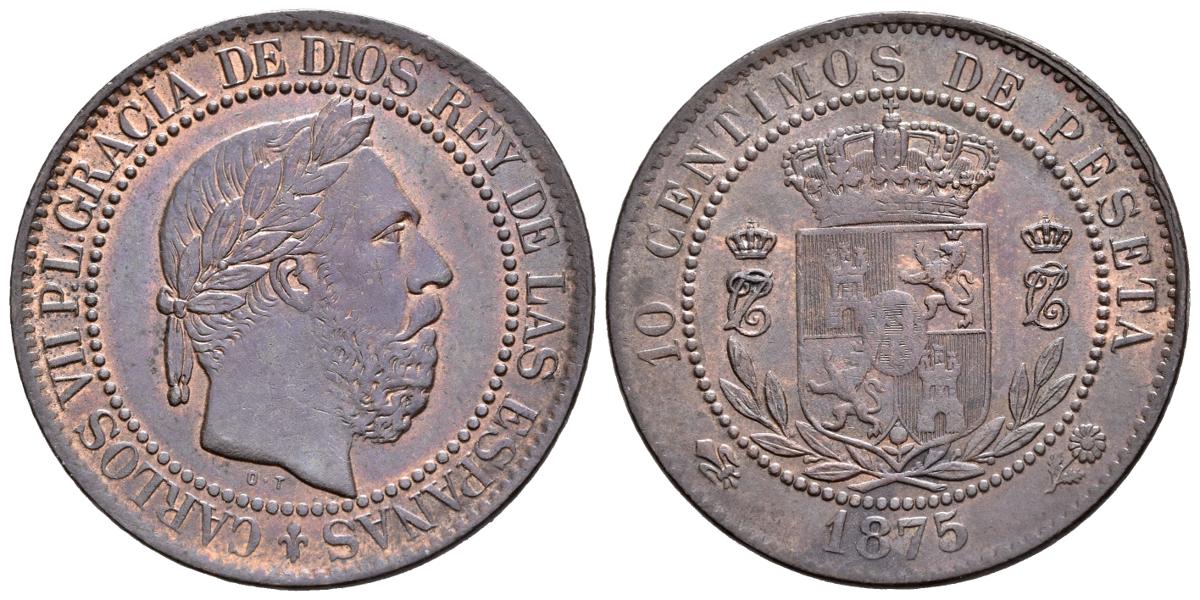 English CARLOS VII, the Pretender (1868-1909). 10 cents (Ae. 10.18g/30mm). 1875. Brussels. (Cal-2019-5). Almost Extremely Fine. Loose minting on reverse.