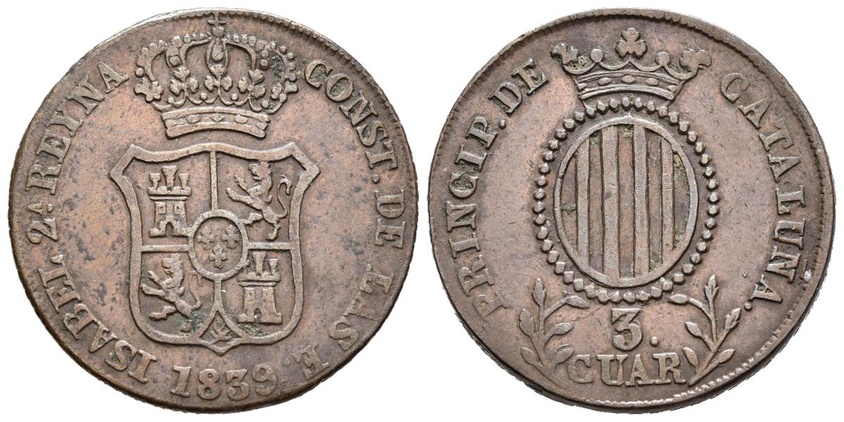 ELIZABETH II (1833-1868). 3 Cuartos (Ae. 7.12g/26mm). 1839. Barcelona. (Cal-2019-7). Very Fine.