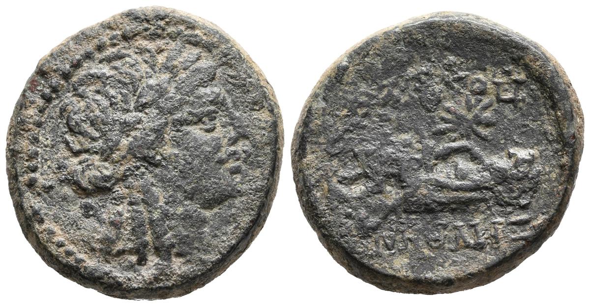 IONIA, Smyrna. Be25. (Ae. 14.42g/25mm). 75-50 BC (Milne 388). Obv: Laureate head of Apollo right. Rev: Poet Homer seated left, star in front, around Greek legend. Almost Very Fine.
