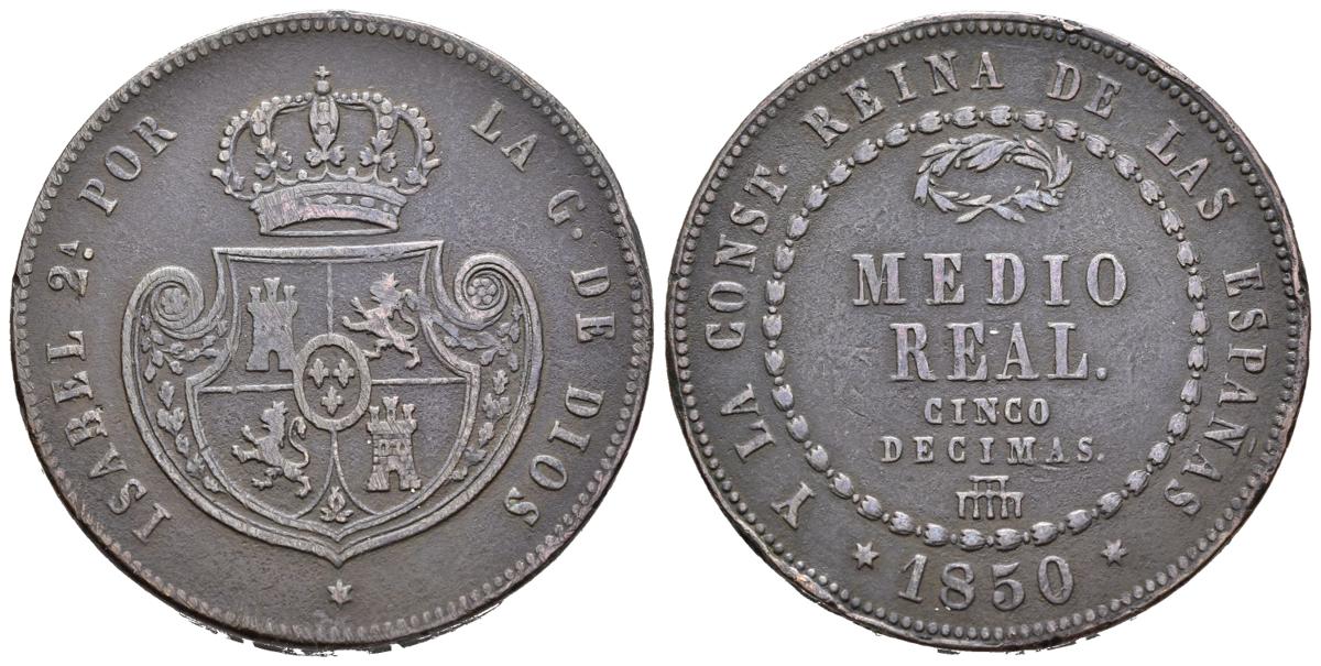 ELIZABETH II (1833-1868). 1/2 Real (5 Tenths) (Ae. 18.32g/32mm). 1850. Segovia. (Cal-2019-155). Very Fine.