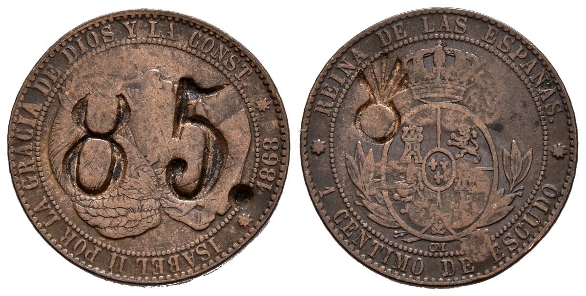 ELIZABETH II (1833-1868). 1 Céntimo de Escudo (Ae. 2.74g/19mm). 1868. Barcelona OM. (Cal-2019-216). Almost Very Fine. Countermark 85 on obverse and pomegranate on reverse.