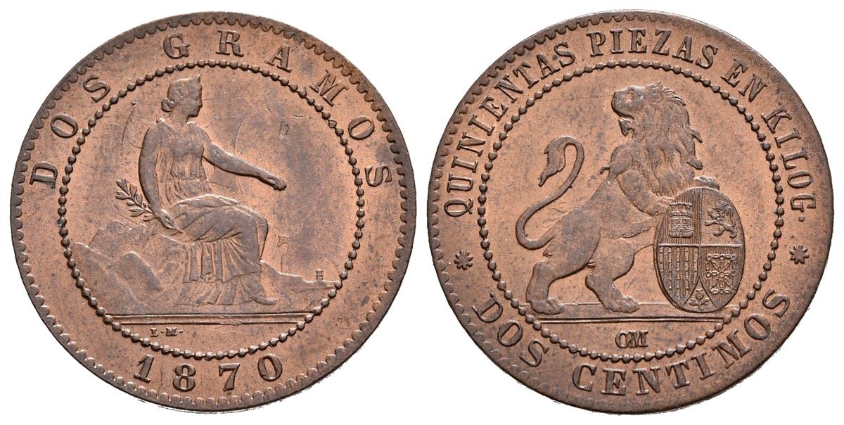PROVISIONAL GOVERNMENT (1868-1871). 2 cents. (Ae. 2.03g/20mm). 1870. Barcelona. (Cal-2019-4). Almost Uncirculated. Nice specimen.
