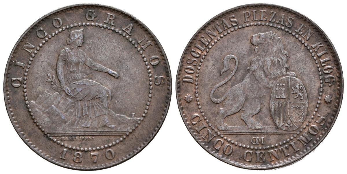 PROVISIONAL GOVERNMENT (1868-1871). 5 cents. (Ae. 4.90g/25mm). 1870. Barcelona. (Cal-2019-5). Good Very Fine.