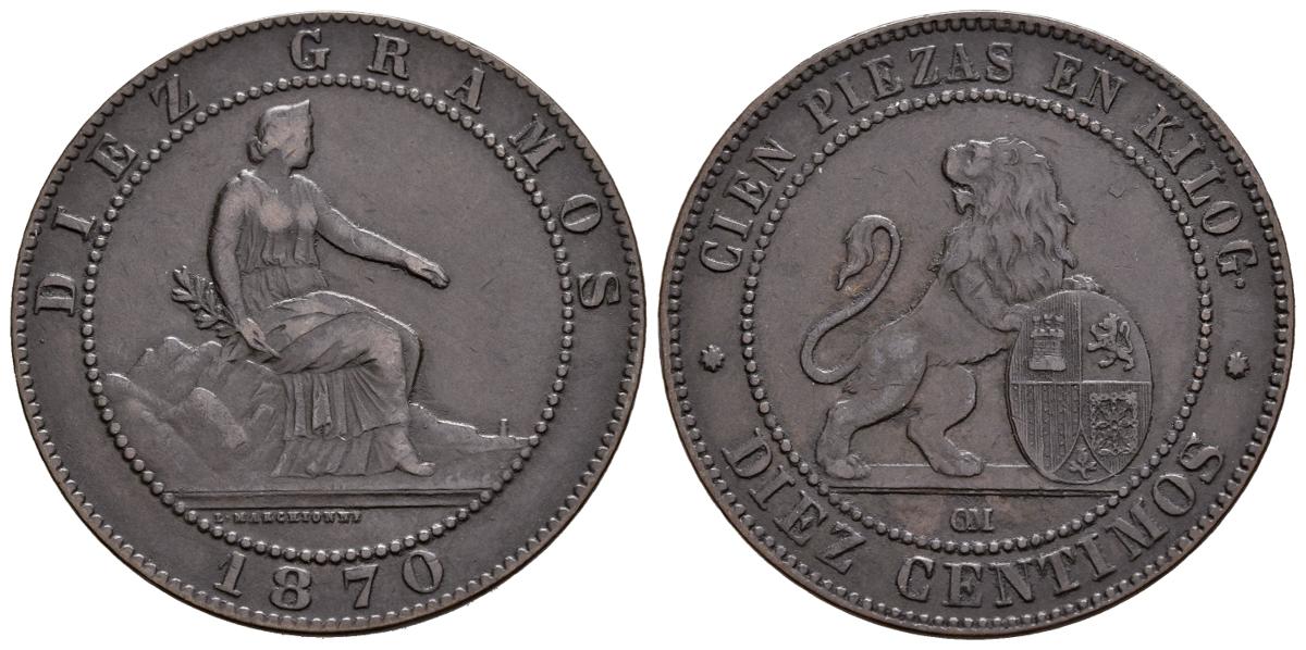 PROVISIONAL GOVERNMENT (1868-1871. 10 cents. (Ae. 9.80g/30mm). 1870. Barcelona. (Cal- Very Fine). VF / VF +. Good copy.