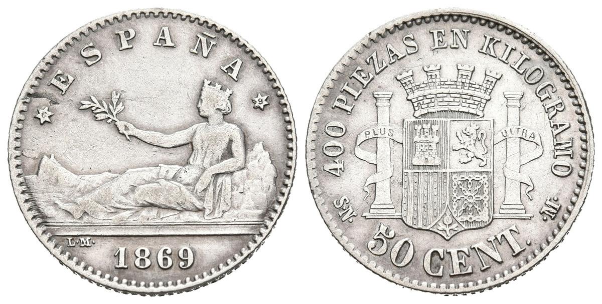 PROVISIONAL GOVERNMENT (1868-1871). 50 cents. (Ar. 2.48g/16mm). 1869 *69. Madrid SNM. (Cal-2019-13). Good Very Fine. perfect stars. Nice specimen.