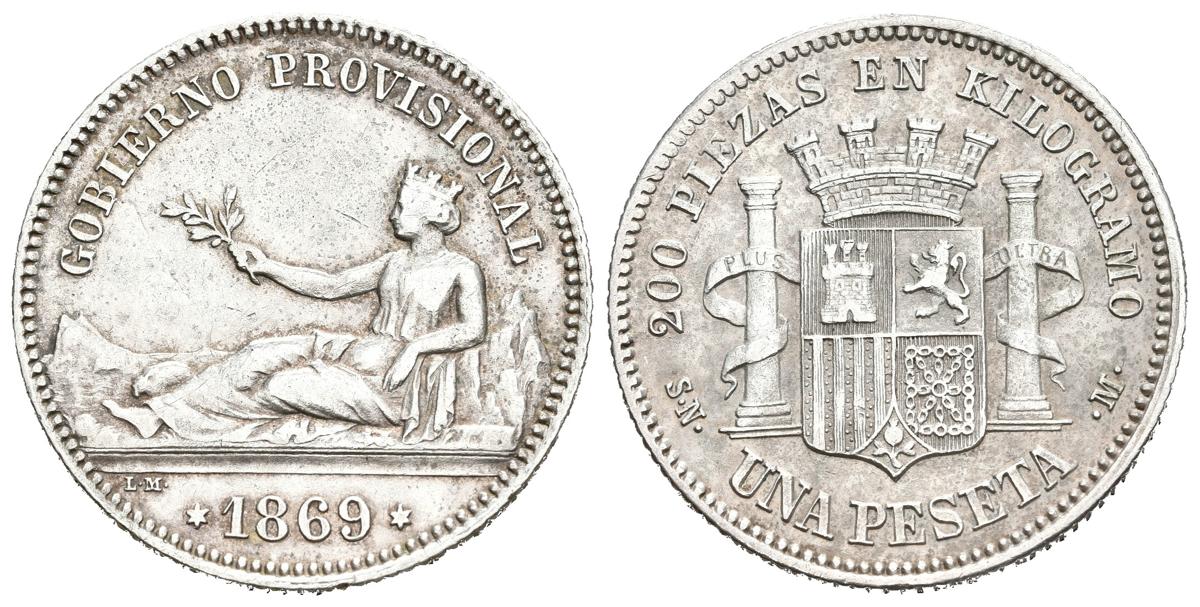 PROVISIONAL GOVERNMENT (1868-1871). 1 Peseta. (Ar. 4.93g/23mm). 1869. Madrid SNM. (Cal-2019-16). Legend: PROVISIONAL GOVERNMENT. Good Very Fine. Good copy.