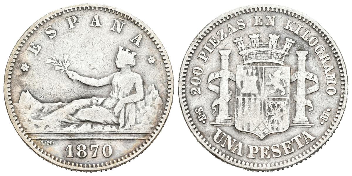 PROVISIONAL GOVERNMENT (1868-1871). 1 Peseta. (Ar. 4.87g/23mm). 1870 *18-70. Madrid SNM. (Cal-2019-18). Almost Very Fine. Partially visible stars.