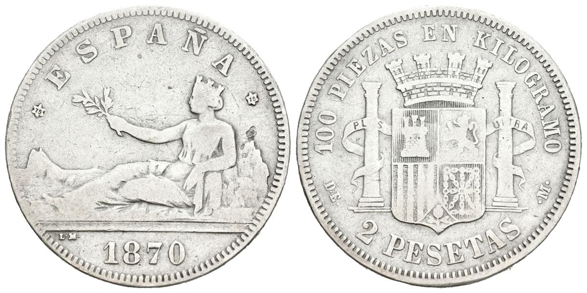 PROVISIONAL GOVERNMENT. 2 pesetas. (Ar. 9.78g/27mm). 1870 *75-18. Madrid DEM. (Cal-2019-34). Almost Very Fine. Obverse sheet. Scarce copy.