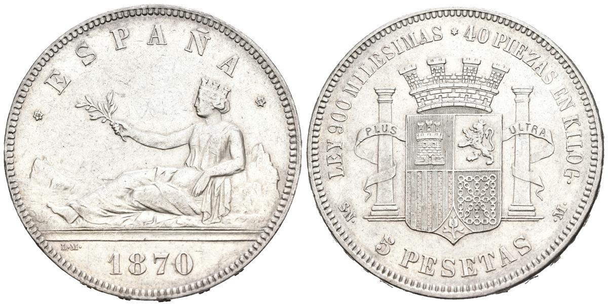 English PROVISIONAL GOVERNMENT (1868-1871). 5 pesetas. (Ar. 24.87g/37mm). 1870 *18-70. Madrid SMN. (Cal-2019-39). Good Very Fine.