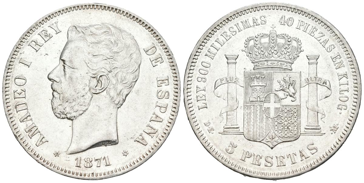 AMADEO I (1871-1873). 5 pesetas. (Ar. 25.01g/37mm). 1871 *18-74. Madrid DEM. (Cal-2019-5). Minted under the First Republic. Good Very Fine/ Almost Extremely Fine. Remnants of original shine.