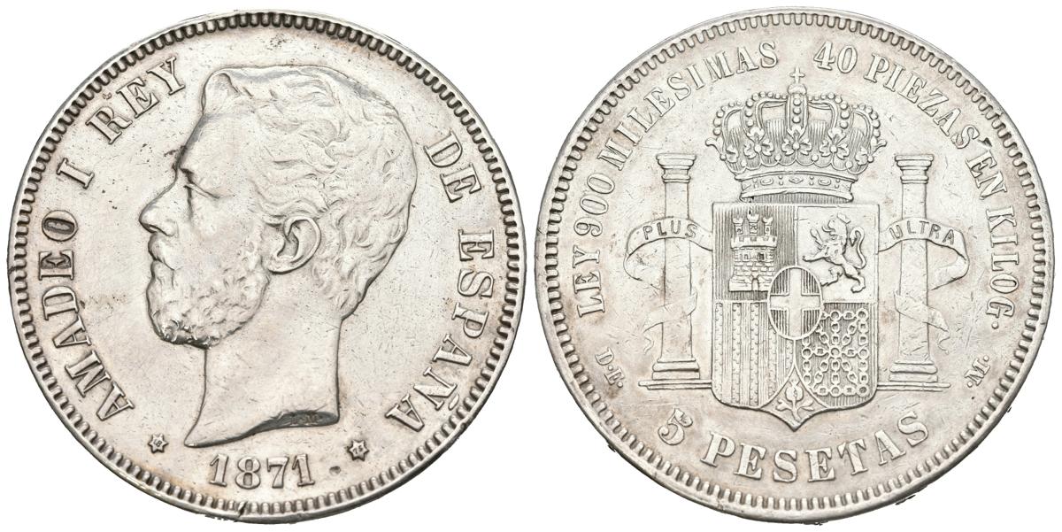 AMADEO I (1871-1873). 5 pesetas. (Ar. 25.10g/37mm). 1871 *18-75. Madrid DEM. (Cal-2019-7). Minted under the reign of Alfonso XII. Very Fine. cleaned.