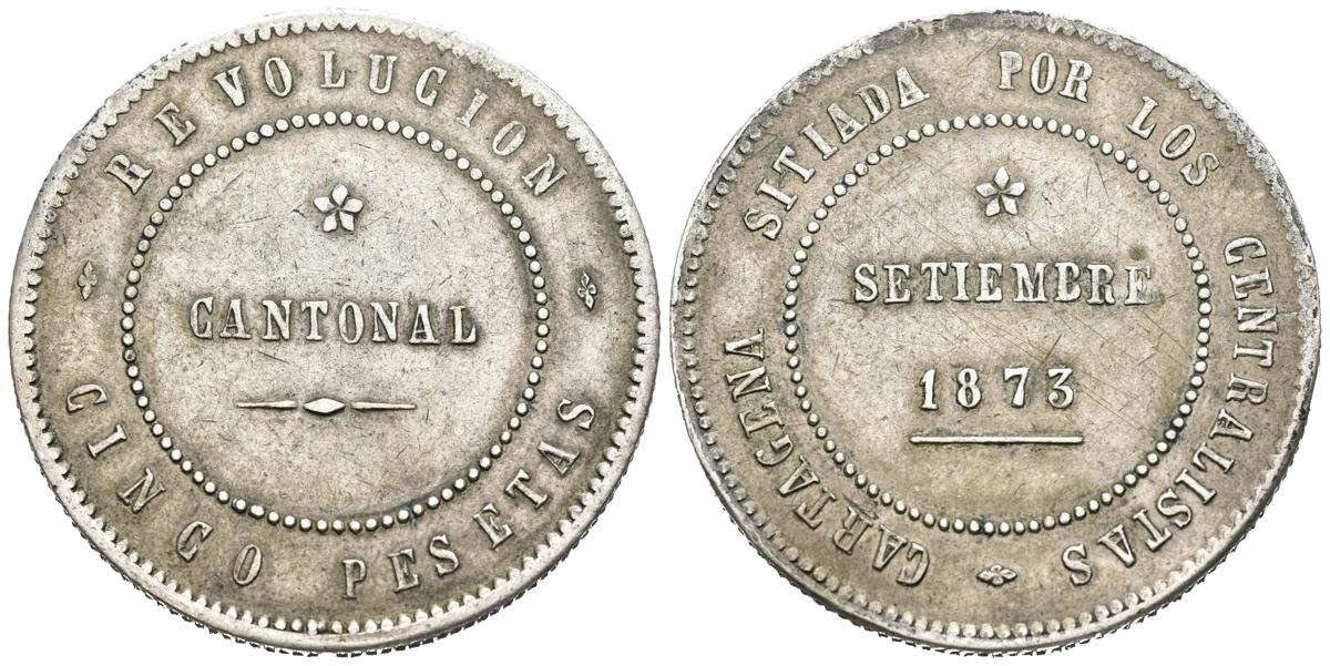CANTONAL REVOLUTION (1873-1874). 5 pesetas. (Ar. 29.80g/37mm). 1873. Cartagena. (Cal-2019-7). 80 pearls on the obverse and 85 on the matching reverse. Very Fine. The first cantonal coins were minted on September 17, 1873 and in the chronicle of the 18th (No. 42 of the Official Gazette of the Federation) we can read: "we have seen the cantonal coins that began to circulate yesterday, snatching them from the hands of those who came to buy them from our coin factory. The duros have an ounce of silver, throwing an excess over those minted by the centralist government of four reales in piece.” On October 20, the Finance Commission of the Canton declares that it has agreed to mint the cantonal currency, giving it weight and grade higher than that conceived by the centralist government, putting into circulation the cantonal currency, whose value is five pesetas in all transactions. The naval industry and its machinery were placed at the service of their manufacture and the promise of amnesty, for all those who were serving a sentence for counterfeiting coins, if they cooperated in the making of dies and in the minting process they provided the labor necessary to bring to light this iconic coin of the Peseta Centenary.