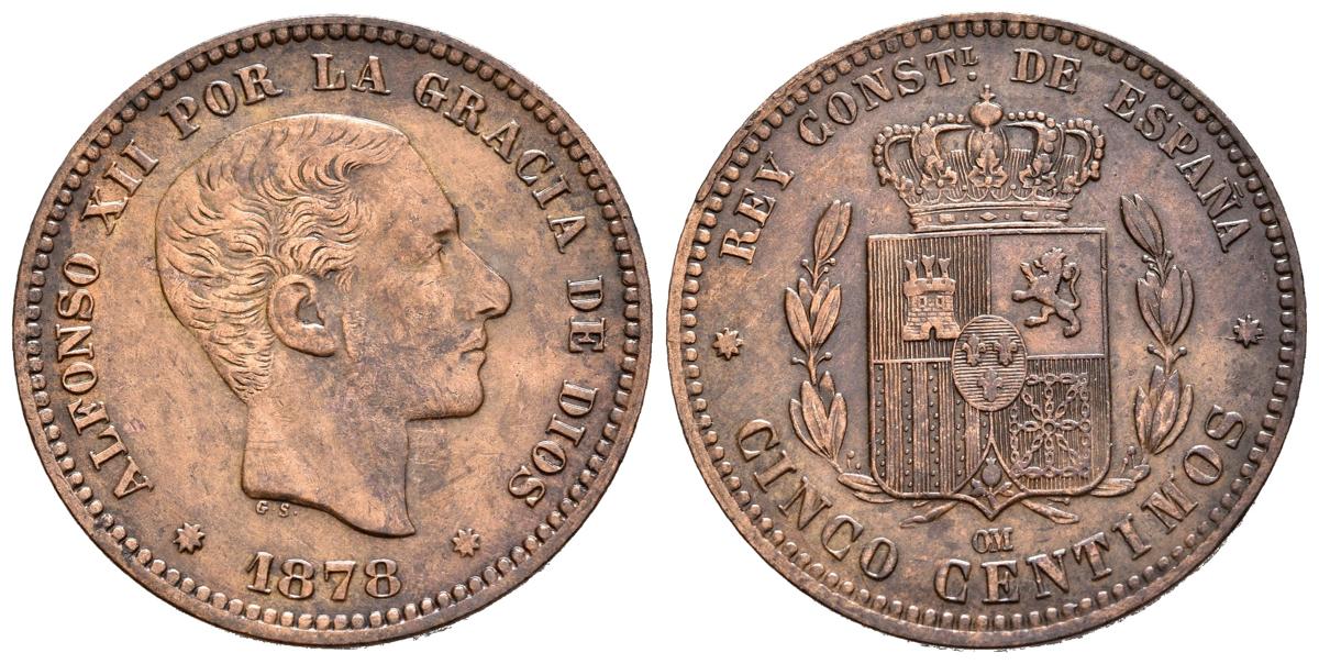 English ALFONSO XII (1874-1885). 5 cents. (Ae. 4.97g/24mm). 1878. Barcelona OM. (Cal-2019-5). Extremely Fine.