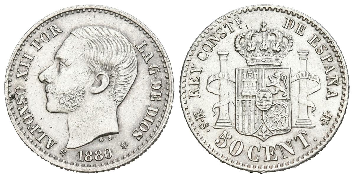 ALFONSO XII (1874-1885). 50 cents. (Ar. 2.51g/18mm). 1880 *8-0. MadridMSM. (Cal-2019-11). Good Extremely Fine. Slight marks. Original Luster .
