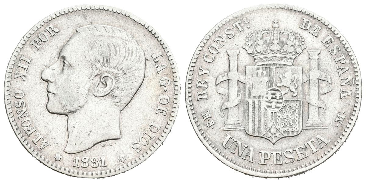 ALFONSO XII (1874-1885). 1 Peseta. (Ar. 4.97/23mm). 1881 *18-81. MadridMSM. (Cal-2019-17). Almost Very Fine. First star only partially visible. Limited.