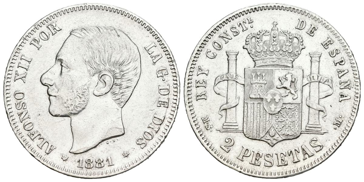 ALFONSO XII (1874-1885). 2 pesetas. (Ar. 9.92g/27mm). 1881 *18-81. MadridMSM. (Cal-2019-28). Very Fine/ Good Very Fine. cleaned.