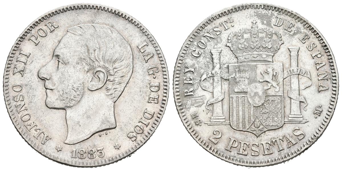 ALFONSO XII (1874-1885). 2 pesetas. (Ar. 9.89g/27mm). 1883 *18-83. MadridMSM. (Cal-2019-33). Very Fine.