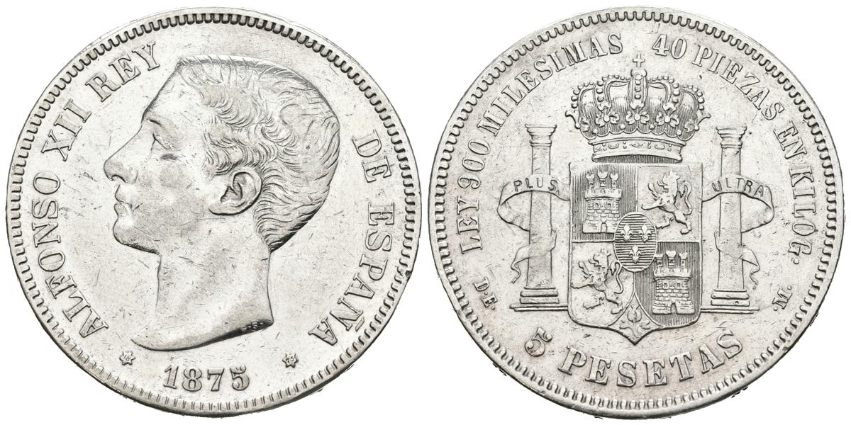 ALFONSO XII (1874-1885). 5 pesetas. (Ar. 24.77g/38mm). 1875 *18-75. Madrid DEM. (Cal-2019-35). Very Fine. cleaned.