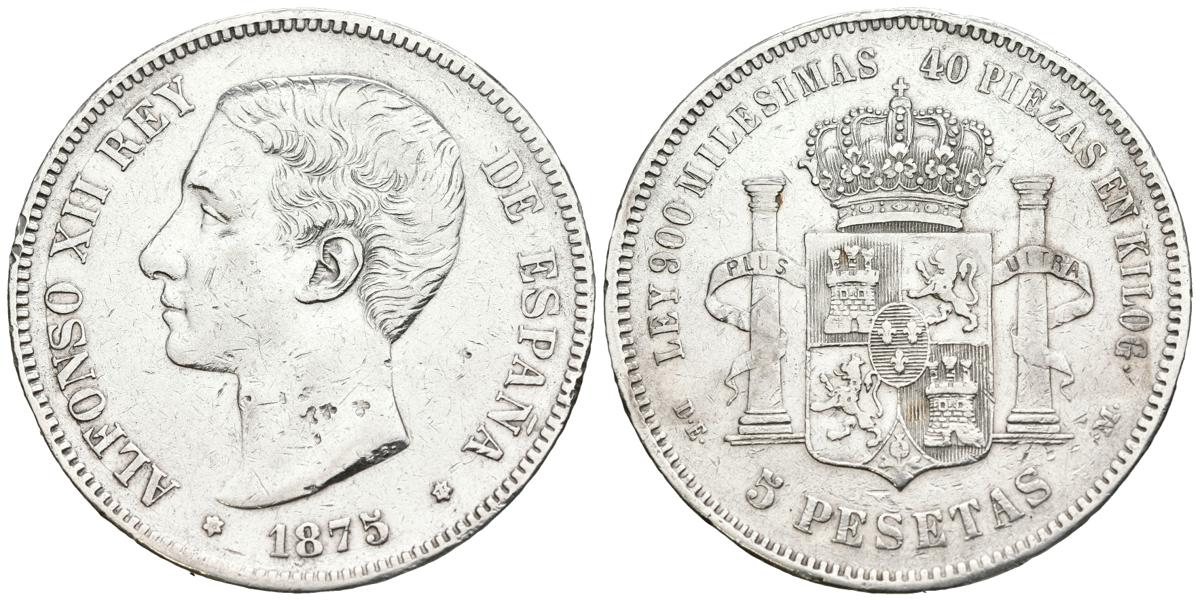 ALFONSO XII (1874-1885). 5 pesetas. (Ar. 24.75g /37mm). 1875 *18-75. Madrid. DEM. (Cal-2019-35). Very Fine. cleaned. Striped ear variant.