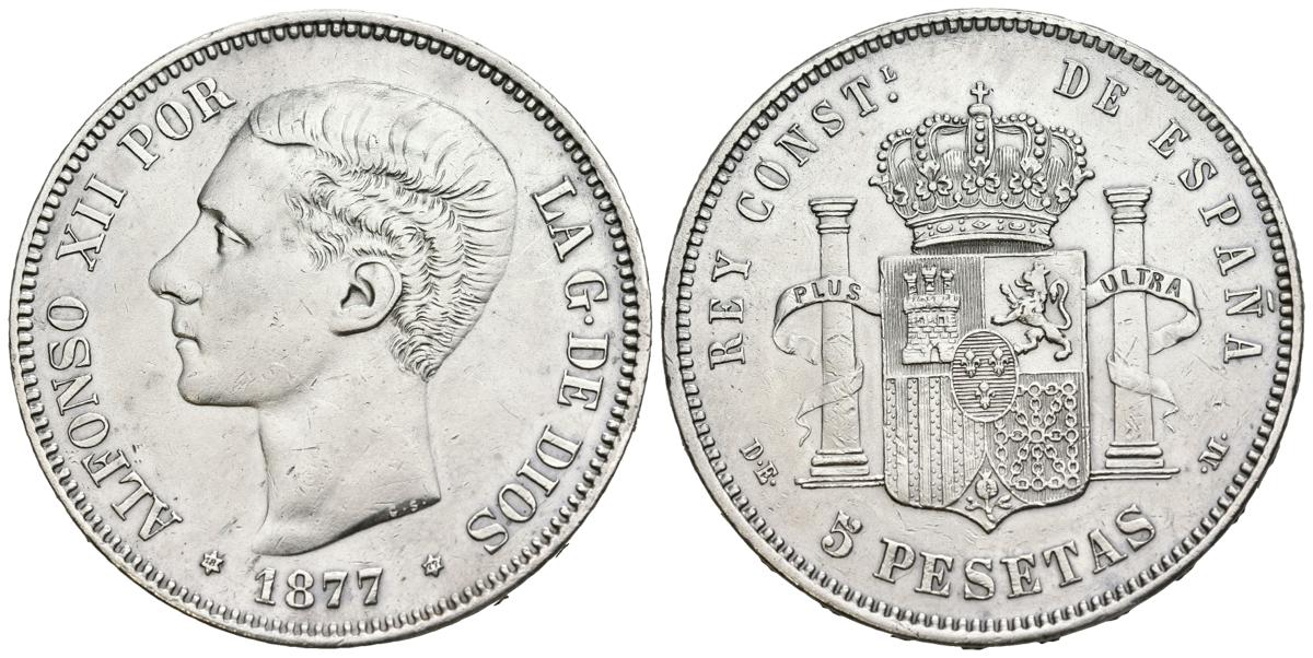 ALFONSO XII (1874-1885). 5 pesetas. (Ar. 25.03g/37mm). 1877 *18-77. Madrid DEM. (Cal-2019-38). Extremely Fine. cleaned.