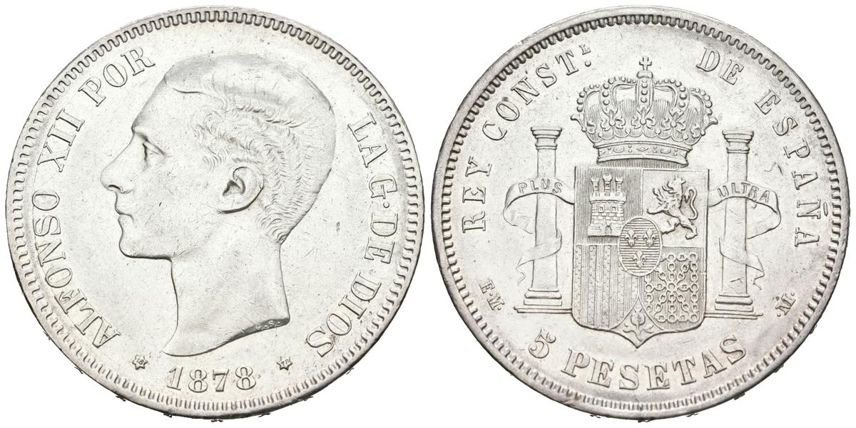 English ALFONSO XII (1874-1885). 5 pesetas. (Ar. 24.97g/37mm). 1878 *18-78. Madrid EMM. (Cal-2019-41). Good Very Fine/ Almost Extremely Fine. Good copy.
