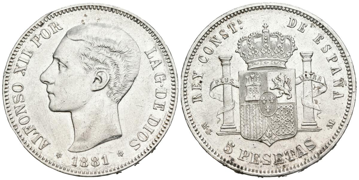 ALFONSO XII (1874-1885). 5 pesetas. (Ar. 25.02g/37mm). 1881 *18-81. MadridMSM. (Cal-2019-44). Good Very Fine. Singing taps.