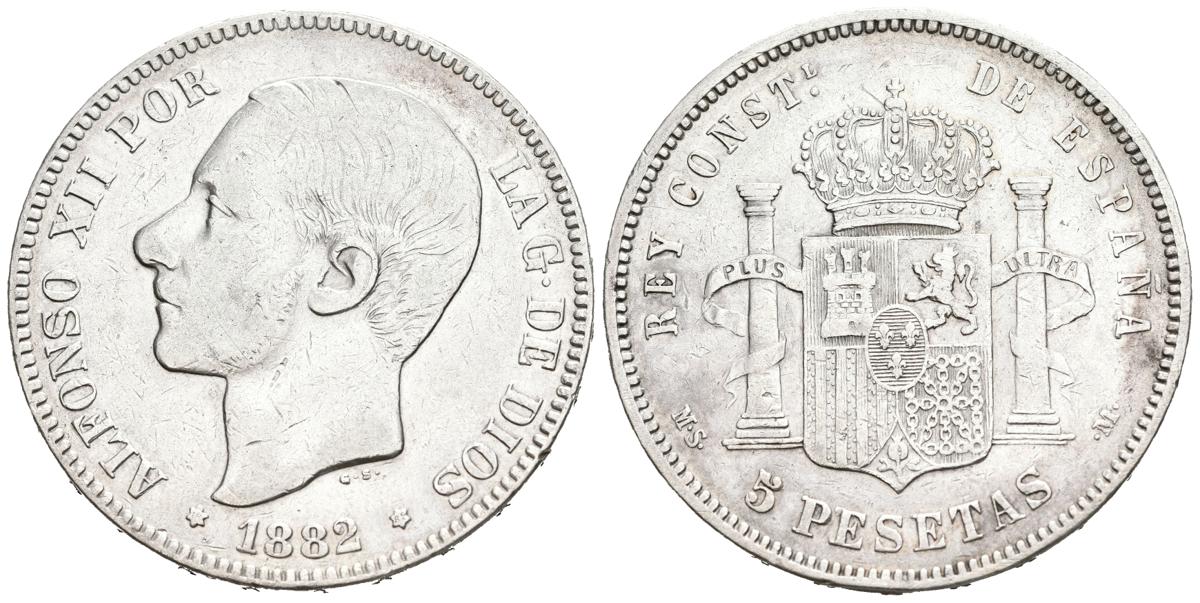 ALFONSO XII (1874-1885). 5 pesetas. (Ar. 24.73g/37mm). 1882 *18-81. MadridMSM. (Cal-2019-48). Almost Very Fine. Limited
