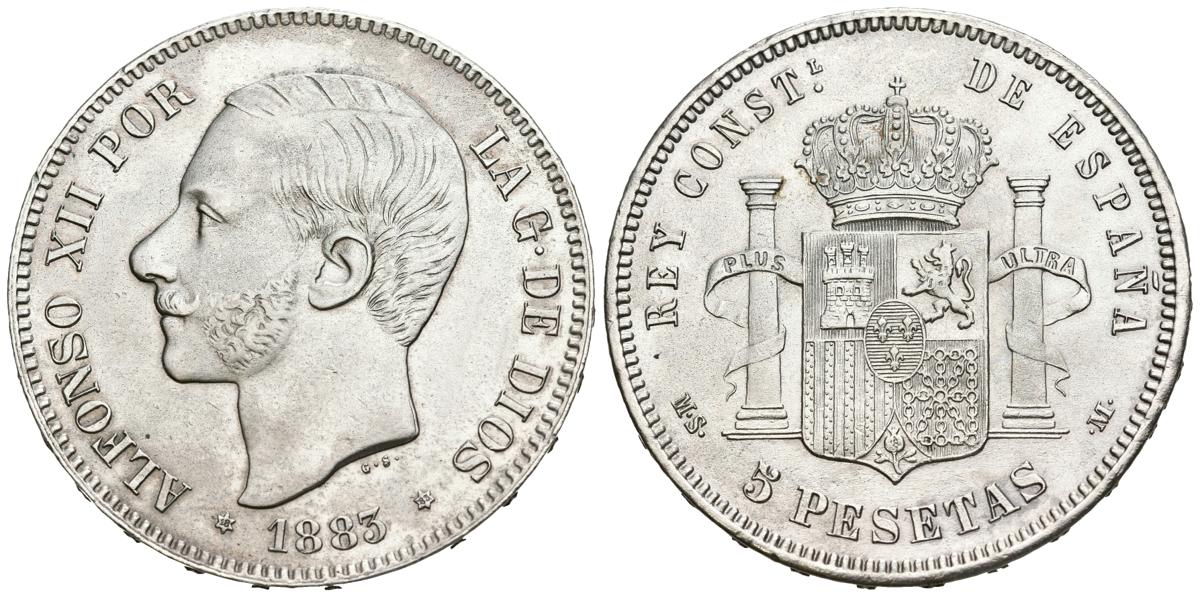English ALFONSO XII (1874-1885). 5 pesetas. (Ar. 24.97g/37mm). 1883 *18-83. MadridMSM. (Cal-2019-55). Extremely Fine. cleaned.