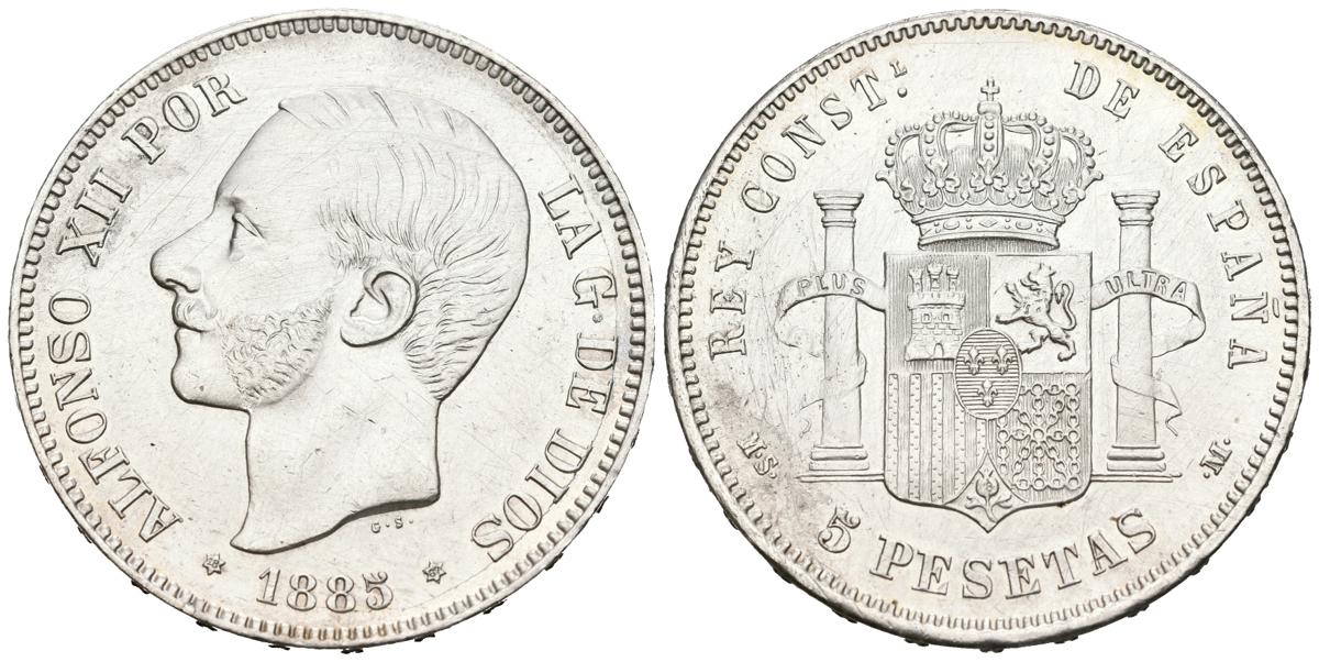 ALFONSO XII (1874-1885). 5 pesetas. (Ar. 24.98g/37mm). 1885 *18-87. MadridMSM. (Cal-2019-62). Minted under the reign of Alfonso XIII. Almost Extremely Fine. Reverse Scratch .