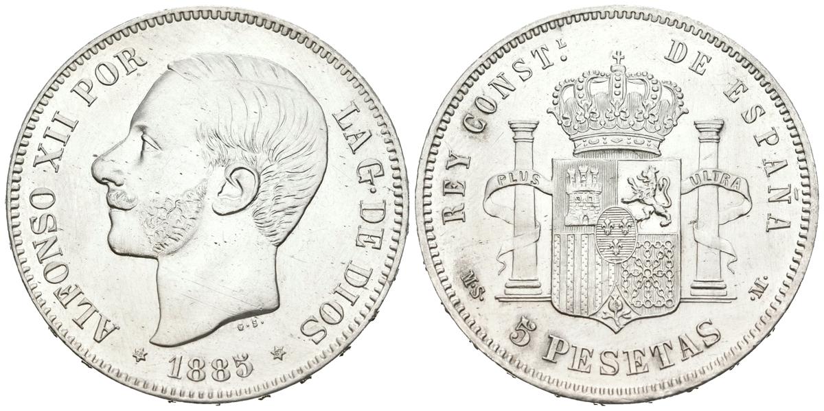 English ALFONSO XII (1874-1885). 5 pesetas. (Ar. 25.01g/37mm). 1885 *18-87. MadridMSM. (Cal-2019-62). Minted under the reign of Alfonso XIII. Extremely Fine/ Good Extremely Fine. cleaned. Slight scratch.