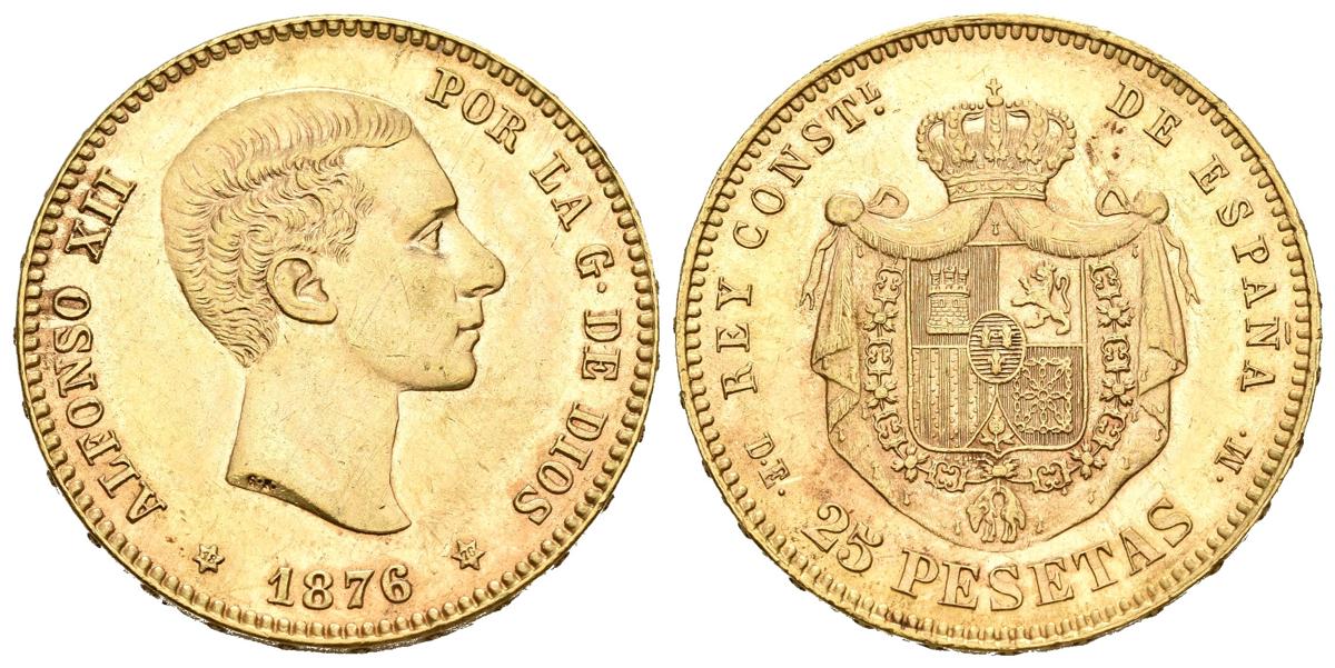 ALFONSO XII (1874-1885). 25 pesetas. (AU 8.05g/24mm). 1876 *18-76. Madrid DEM. (Cal-2019-67). Almost Extremely Fine. Slight scratch.