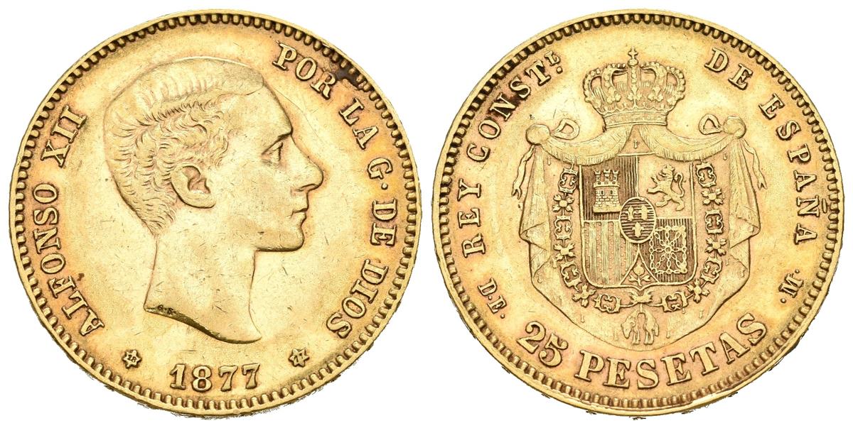 ALFONSO XII (1874-1885). 25 pesetas. (Au 8.06g/24mm). 1877 *18-77. Madrid DEM. (Cal-2019-68). Good Very Fine.