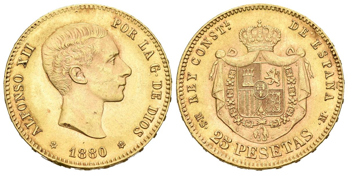English ALFONSO XII (1874-1885). 25 pesetas. (Au 8.07g/24mm). 1880 *18-80. MadridMSM. (Cal-2019-79). Almost Extremely Fine.