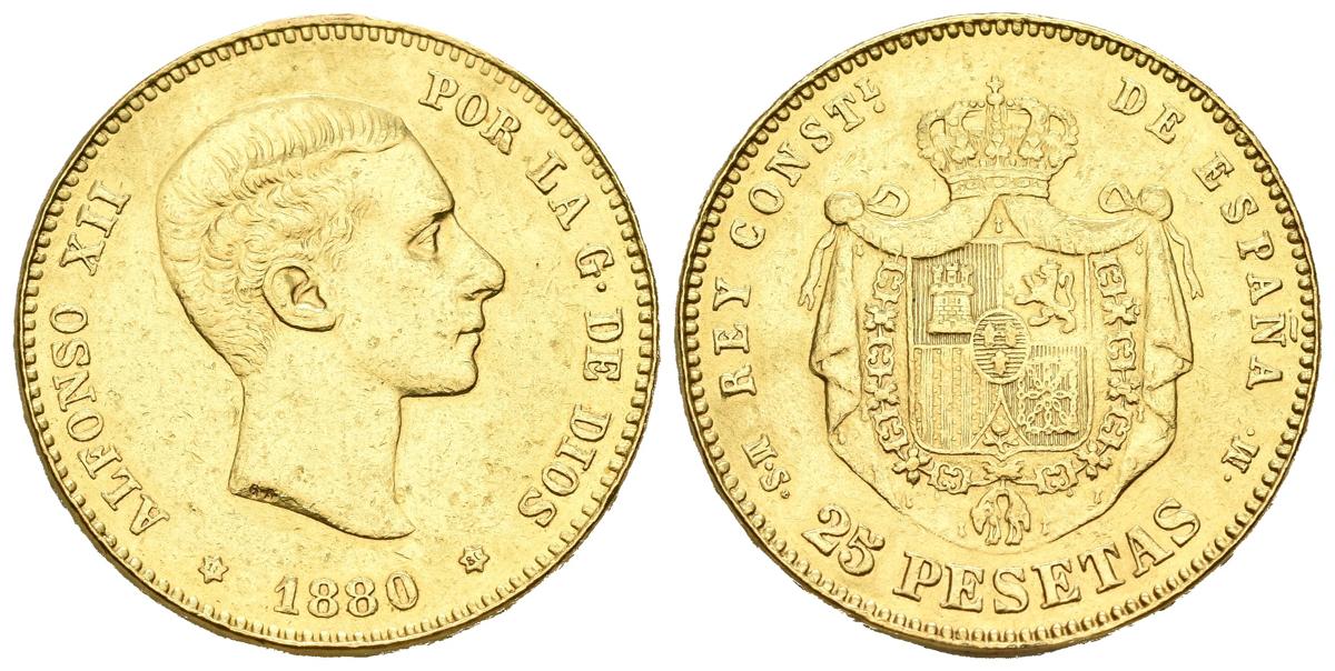 English ALFONSO XII (1874-1885). 25 pesetas. (Au 8.04g/24mm). 1880 *18-80. MadridMSM. (Cal-2019-79). Very Fine. It was hooked.