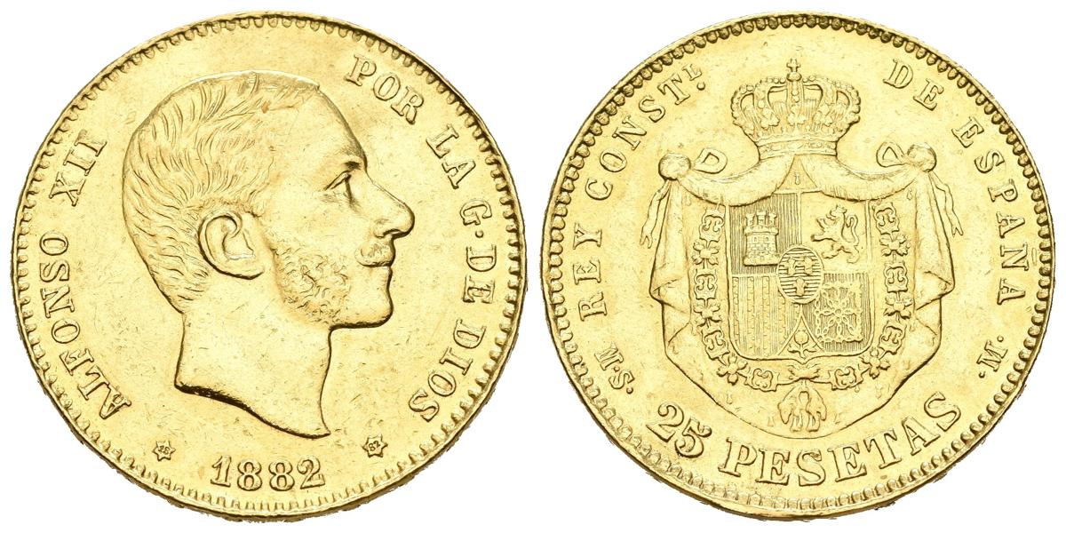 English ALFONSO XII (1874-1885). 25 pesetas. (AU 8.05g/24mm). 1882 *18-82. MadridMSM. (Cal-2019-85). Good Very Fine. Worn as jewelry.