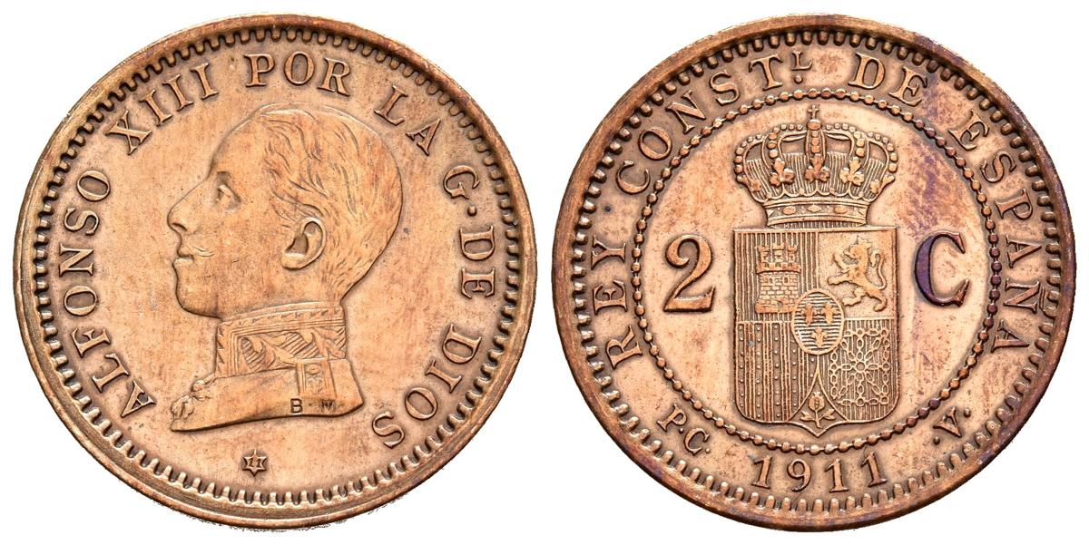 ALFONSO XIII (1885-1931). 2 cents. (Ae. 2.06g/20mm). 1911 *11. Madrid PCV. (Cal-2019-13). Uncirculated.