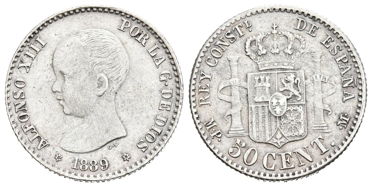 English ALFONSO XIII (1885-1931). 50 cents. (Ar. 2.44g/18mm). 1889 *8-9. Madrid MPM. (Cal-2019-27). Very Fine.