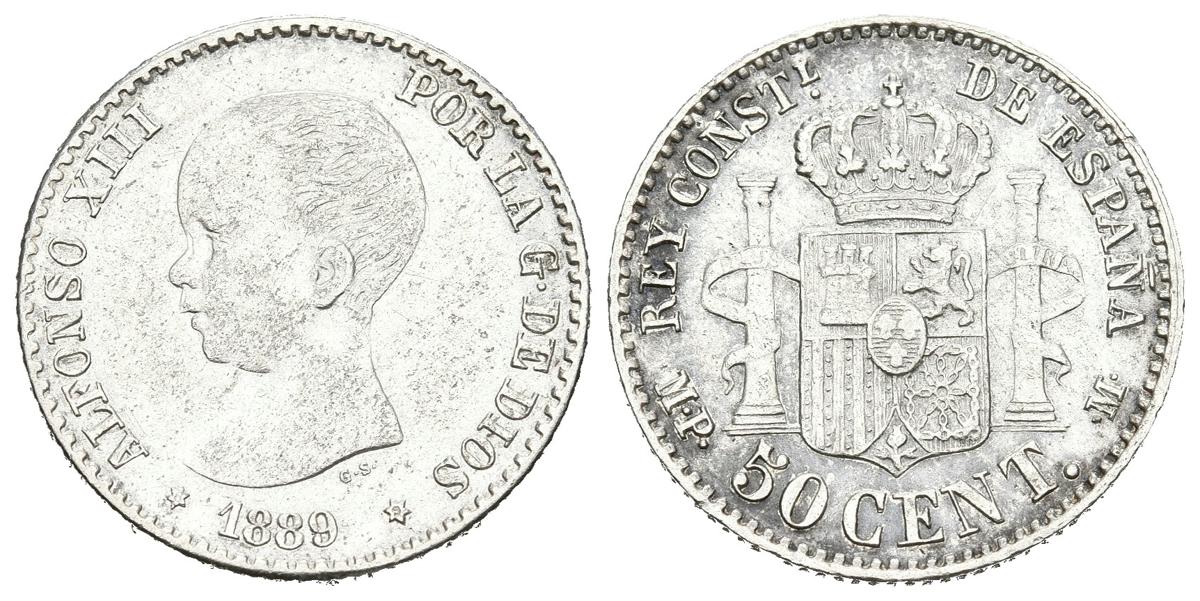 ALFONSO XIII (1885-1931). 50 cents. (Ar. 2.48g/18mm). 1889 *8-9. Madrid MPM. (Cal-2019-27). Good Very Fine. Cleaning Scratch .